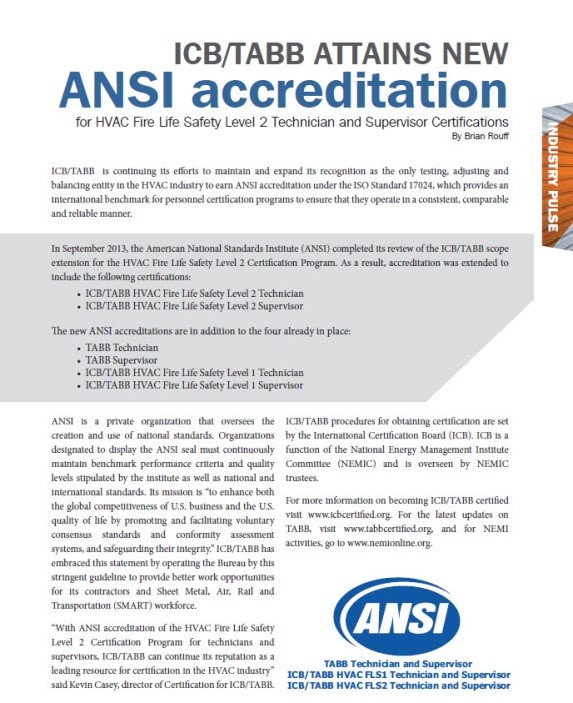 ICB/TABB is continuing its efforts to maintain and expand its recognition as the only testing, adjusting and balancing entity in the HVAC industry to earn ANSI accreditation under the ISO Standard 17024, which provides an international benchmark for personnel certification programs to ensure that they operate in a consistent, comparable and reliable manner. The American National Standards Institute (ANSI) completed its review of the ICB/TABB scope extension for the HVAC Fire Life Safety Level 2 Certification Program. As a result, accreditation was extended to include the following certifications: